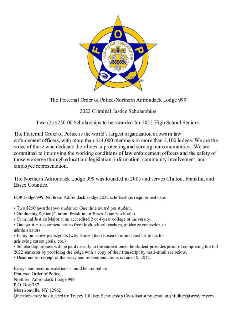 The Fraternal Order of PoliceNorthern Adirondack Lodge 999 2022 Criminal Justice Scholarships Two (2) $250.00 Scholarships to be awarded for 2022 High School Seniors. The Fraternal Order of Police