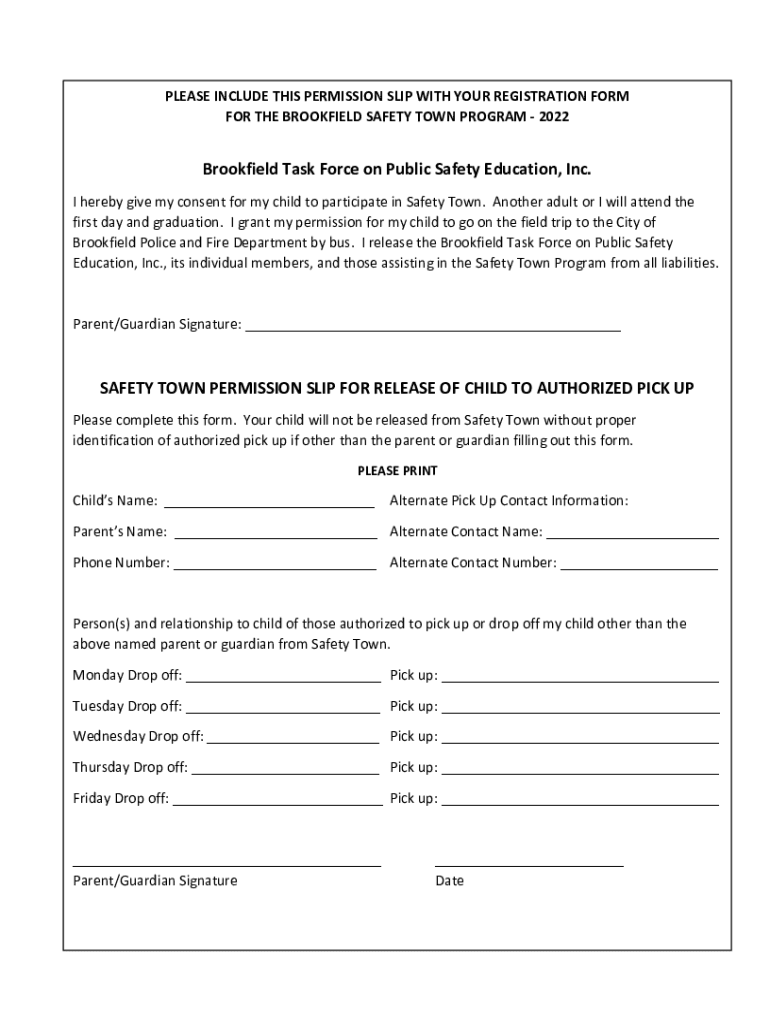 PLEASE INCLUDE THIS PERMISSION SLIP WITH YOUR REGISTRATION FORM FOR THE BROOKFIELD SAFETY TOWN PROGRAM 2022Brookfield Task Force on Public Safety Education, Inc. I hereby give my consent for my child