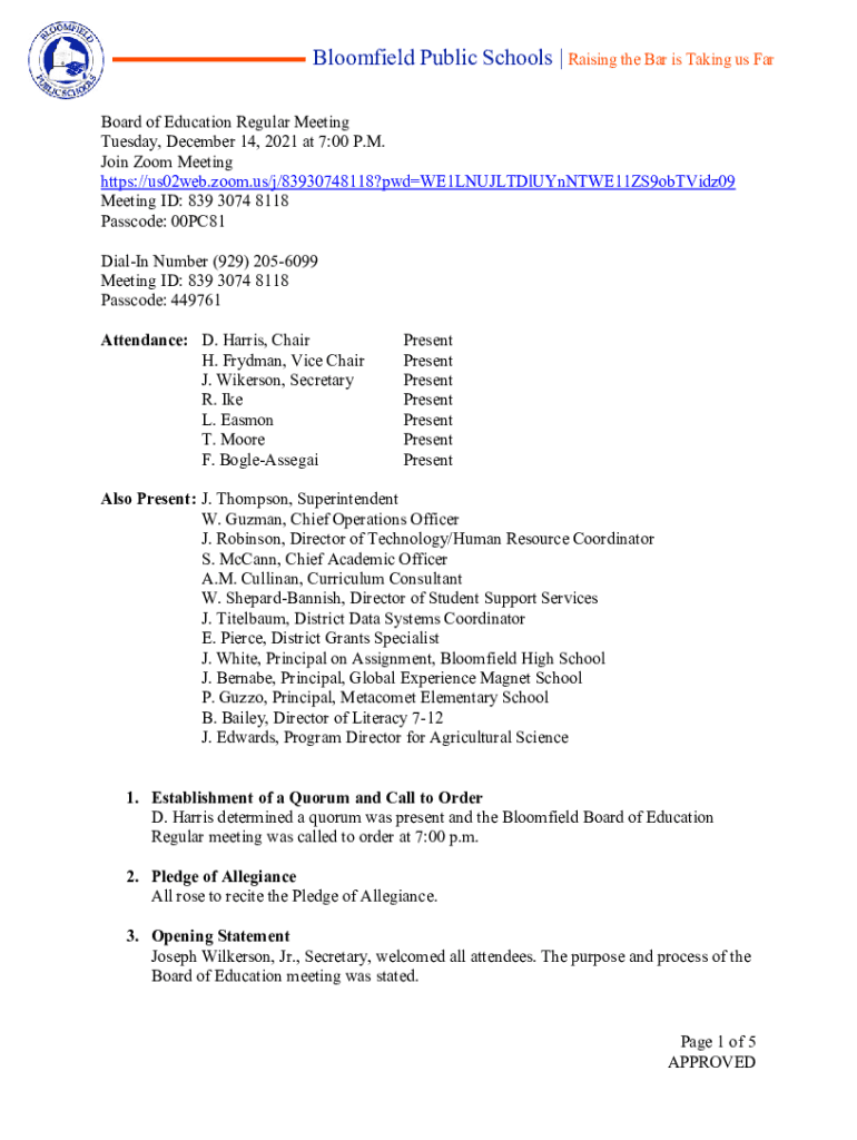 Bloomfield Public Schools | Raising the Bar is Taking us Far Board of Education Regular Meeting Tuesday, December 14, 2021, at 7:00 P.M. Join Zoom Meeting https://us02web.zoom.us/j/83930748118?pwdWE1LNUJLTDlUYnNTWE11ZS9obTVidz09