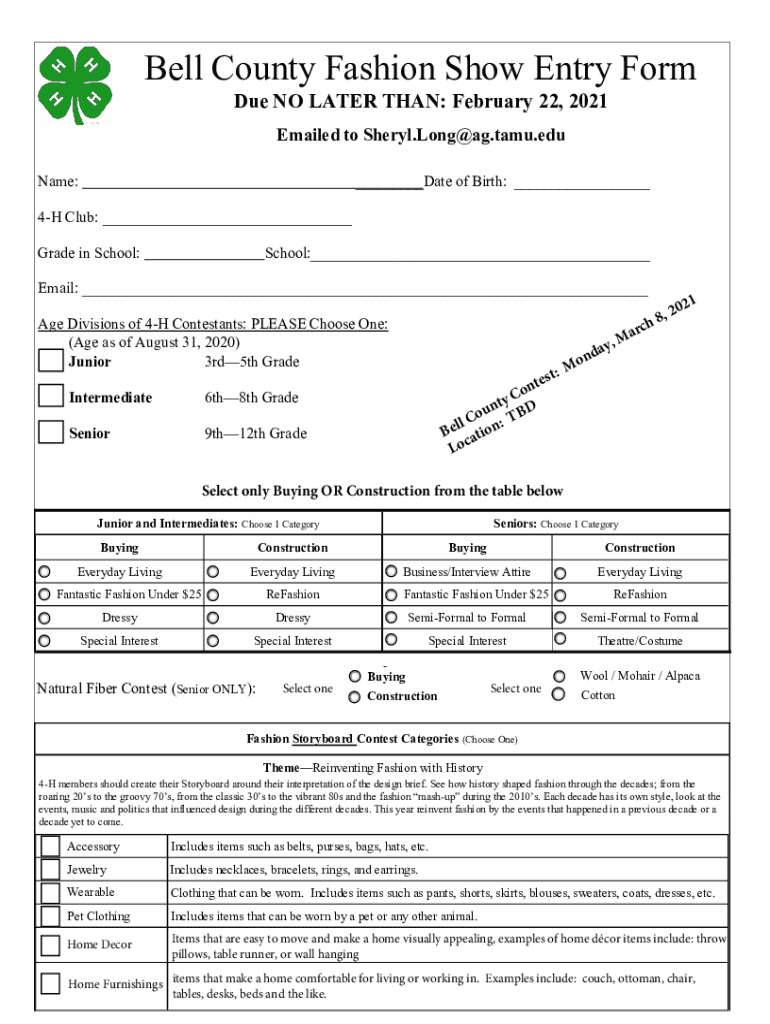 Bell County Fashion Show Entry Form Due NO LATER THAN: February 22, 2021, Emailed to Sheryl.Long@ag.tamu.edu Name:___Date of Birth: ___4H Club: ___ Grade in School:School:___Email: ___ Age Divisions