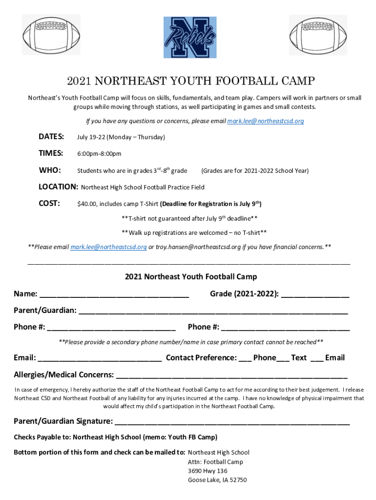 2021 NORTHEAST YOUTH FOOTBALL CAMP Northeasts Youth Football Camp will focus on skills, fundamentals, and team play. Campers will work in partners or small groups while moving through stations, as