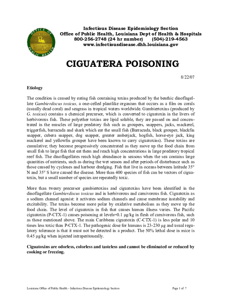 Infectious Disease Epidemiology Section Office of Public Health, Louisiana Dept of Health & Hospitals 8002562748 (24 hr number) (504)2194563 www.infectiousdisease.dhh.louisiana.govCIGUATERA POISONING