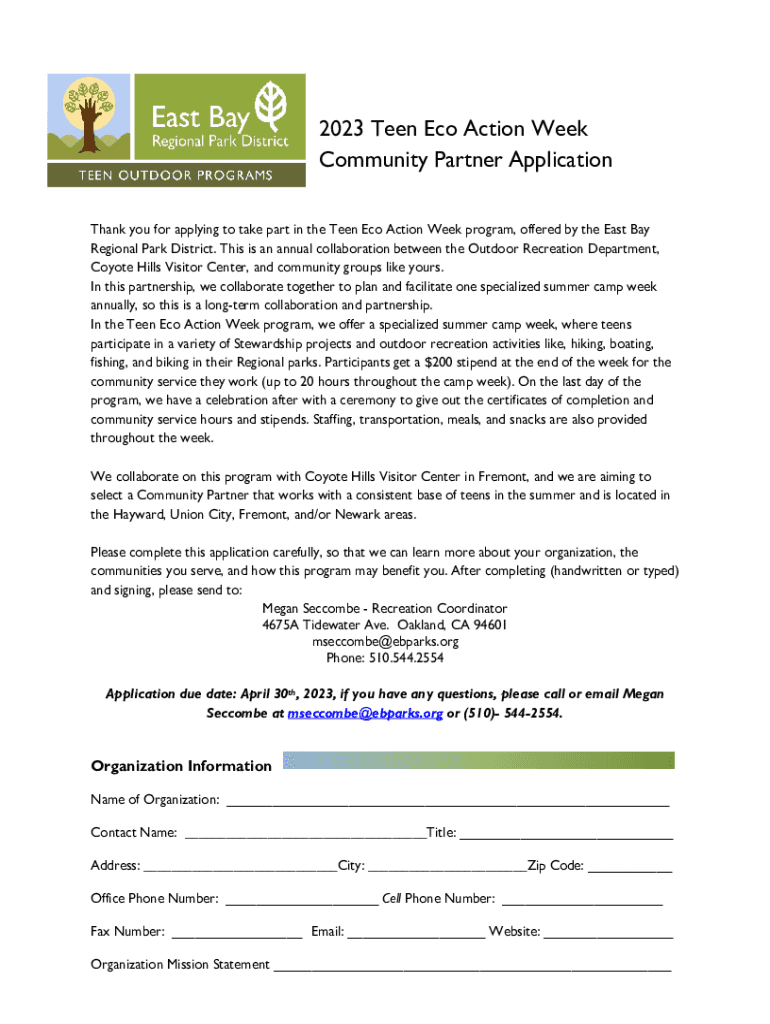 2023 Teen Eco Action Week Community Partner Application Thank you for applying to take part in the Teen Eco Action Week program, offered by the East Bay Regional Park District. This is an annual collaboration