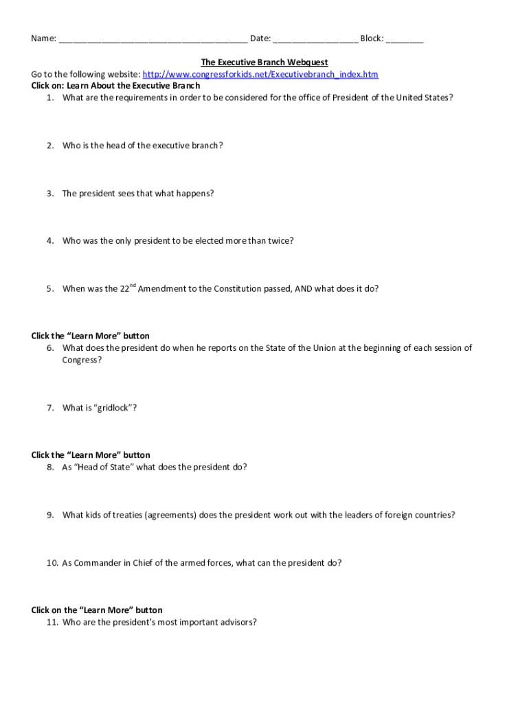 Name: ___ Date: ___ Block: ___ The Executive Branch WebQuest Go to the following website: http://www.congressforkids.net/Executivebranch_index.htm Click on: Learn About the Executive Branch 1. What