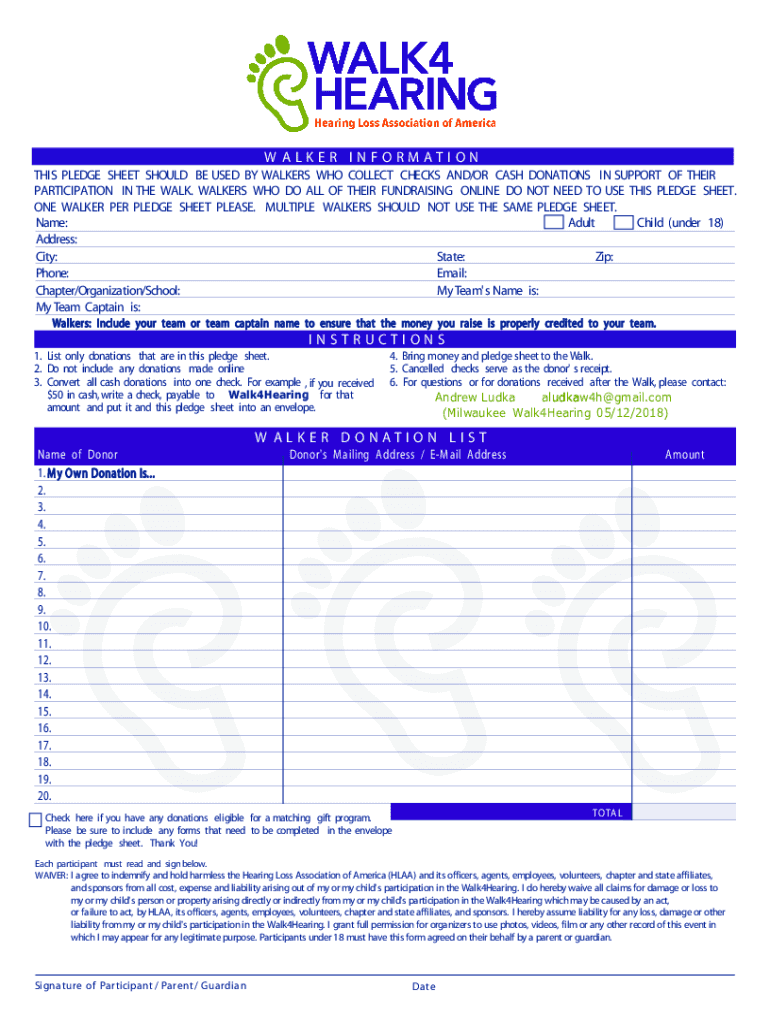 Get the free this pledge sheet should be used by walkers ... - Walk4Hearing