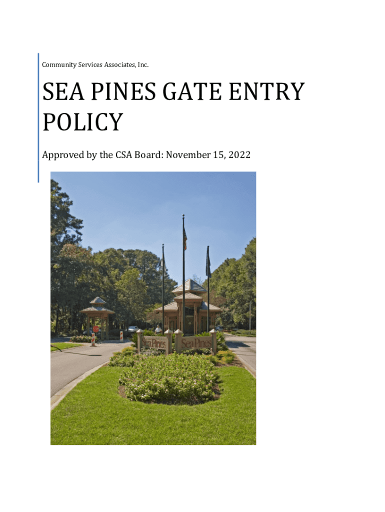 Community Services Associates, Inc. SEA PINES GATE ENTRY POLICY Approved by the CSA Board: November 15, 2022PREAMBLE Authority: Under the 1988 Covenants, Sea Pines Gate Policy shall be enforced by