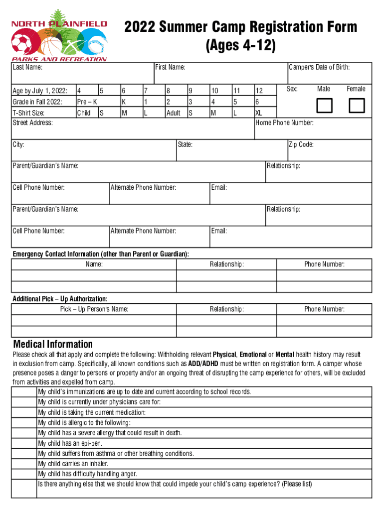 2022 Summer Camp Registration Form (Ages 412) Last Name:First Name:Age by July 1, 2022:4Grade in Fall 2022:PRE Shirt Size: Street Address:Child5 Scamper\'s Date of Birth:89101112K123456MLAdultSMLXL