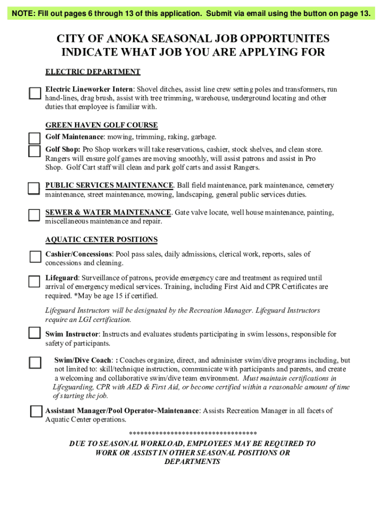 2015 First Avenue, ANOVA, MN 55303 Phone: (763) 5762700 Website: www.anokaminnesota.comNEW HIRES REAPPLICATION FOR 2022 SUMMER SEASONAL WORK Thank you for your interesting in working as a Summer Seasonal