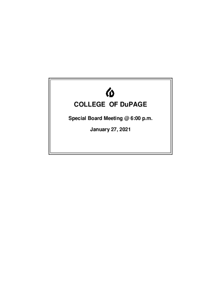 COLLEGE OF Dupage Special Board Meeting @ 6:00 p.m. January 27, 2021NOTICE AND AGENDA REGULAR BOARD MEETING OF THE BOARD OF TRUSTEES OF COMMUNITY COLLEGE DISTRICT #502, COUNTIES OF Dupage, COOK AND