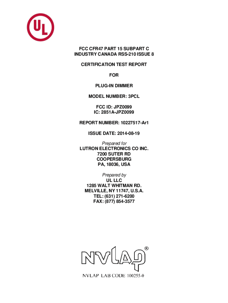 FCC CFR47 PART 15 SUBPART C INDUSTRY CANADA RSS210 ISSUE 8 CERTIFICATION TEST REPORT FOR PLUGIN DIMMER MODEL NUMBER: 3PCL FCC ID: JPZ0099 IC: 2851AJPZ0099 REPORT NUMBER: 10227517Ar1 ISSUE DATE: 20140819