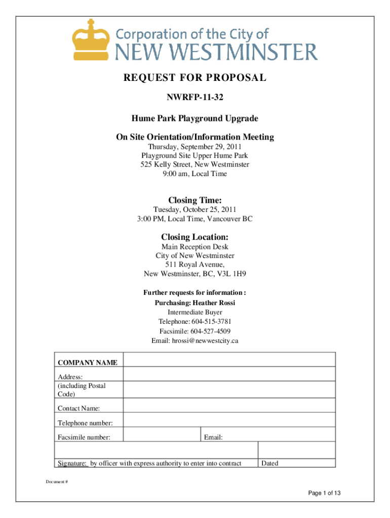 REQUEST FOR PROPOSAL NWRFP1132 Hume Park Playground Upgrade On Site Orientation/Information Meeting Thursday, September 29, 2011, Playground Site Upper Hume Park 525 Kelly Street, New Westminster