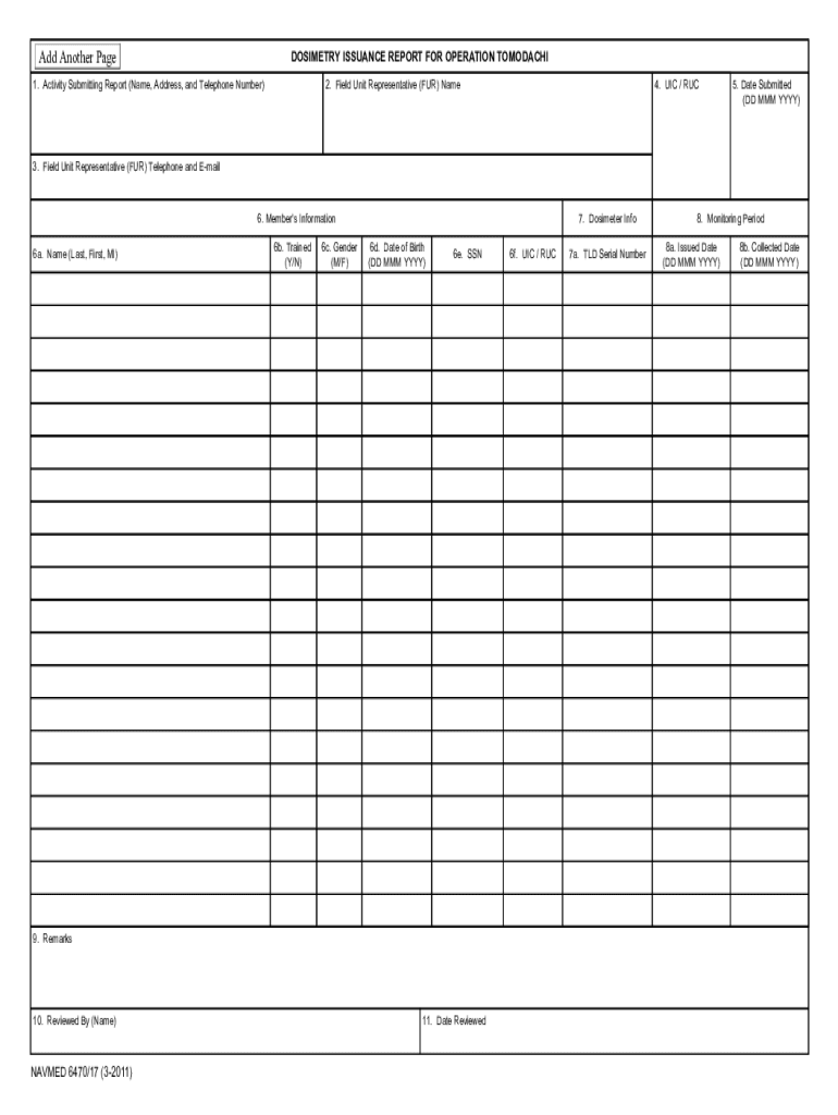 Get the free NAVMED 6470/17. DOSIMETRY ISSUANCE REPORT FOR OPERATION TOMODACHI