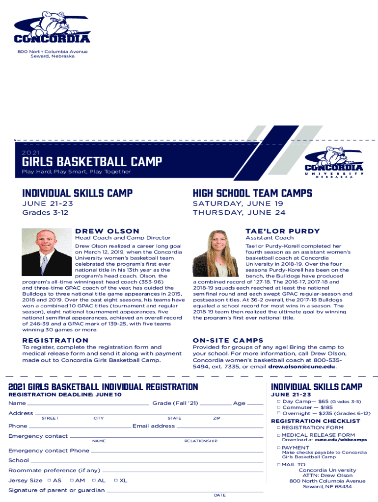 800 North Columbia Avenue Seward, Nebraska2021Girls Basketball Camp Play Hard, Play Smart, Play Together individual Skills campaign School Team capsule 2123 Grades 312SATURDAY, JUNE 19 THURSDAY, JUNE