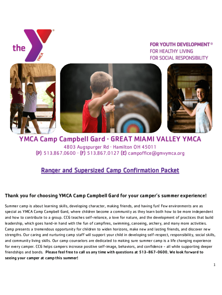 YMCA Camp Campbell Hard GREAT MIAMI VALLEY YMCA 4803 Augsburg Rd Hamilton OH 45011 (P) 513.867.0600 (F) 513.867.0127 (E) campoffice@gmvymca.orgRanger and Supersized Camp Confirmation PacketThank you