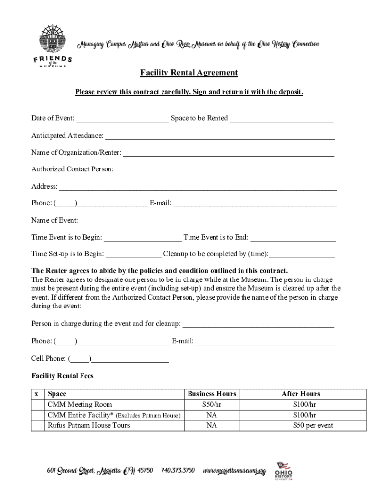 Facility Rental Agreement Please review this contract carefully. Sign and return it with the deposit. Date of Event: ___ Space to be Rented ___ Anticipated Attendance: ___ Name of Organization/Renter: