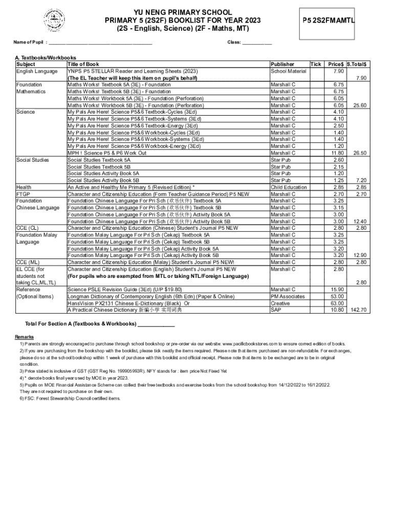 YOU DENG PRIMARY SCHOOL PRIMARY 5 (2S2F) BOOKLET FOR YEAR 2023 (2S English, Science) (2F Math, MT) Name of Pupil : ___P5 2S2FMAMTLClass: ___A. Textbooks/Workbooks Subject Title of Book English Language