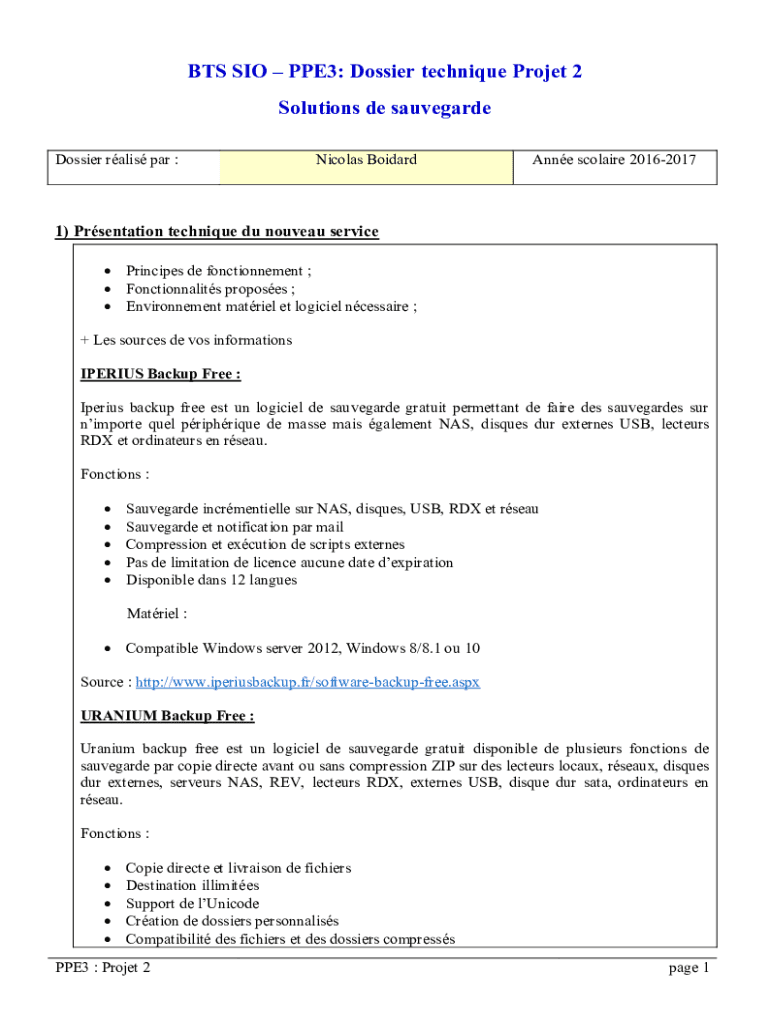 Get the free BTS SIO PPE3: Dossier technique Projet 2 Solutions de sauvegarde