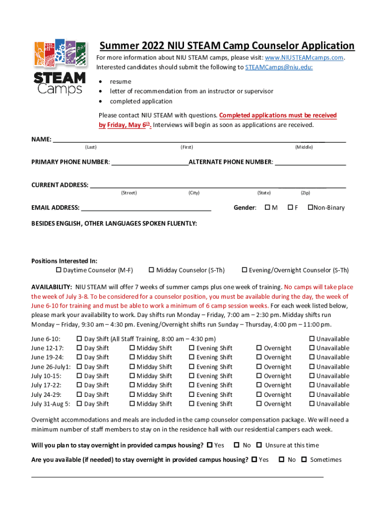 Summer 2022 NIU STEAM Camp Counselor Application more information about NIU STEAM camps, please visit: www.NIUSTEAMcamps.com. Interested candidates should submit the following to STEAMCamps@niu.edu: