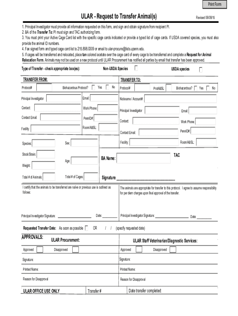 Print Formula Request to Transfer Animal(s)Revised 06/08/151. Principal Investigator must provide all information requested on this form, and sign and obtain signature from recipient PI. 2. BA of