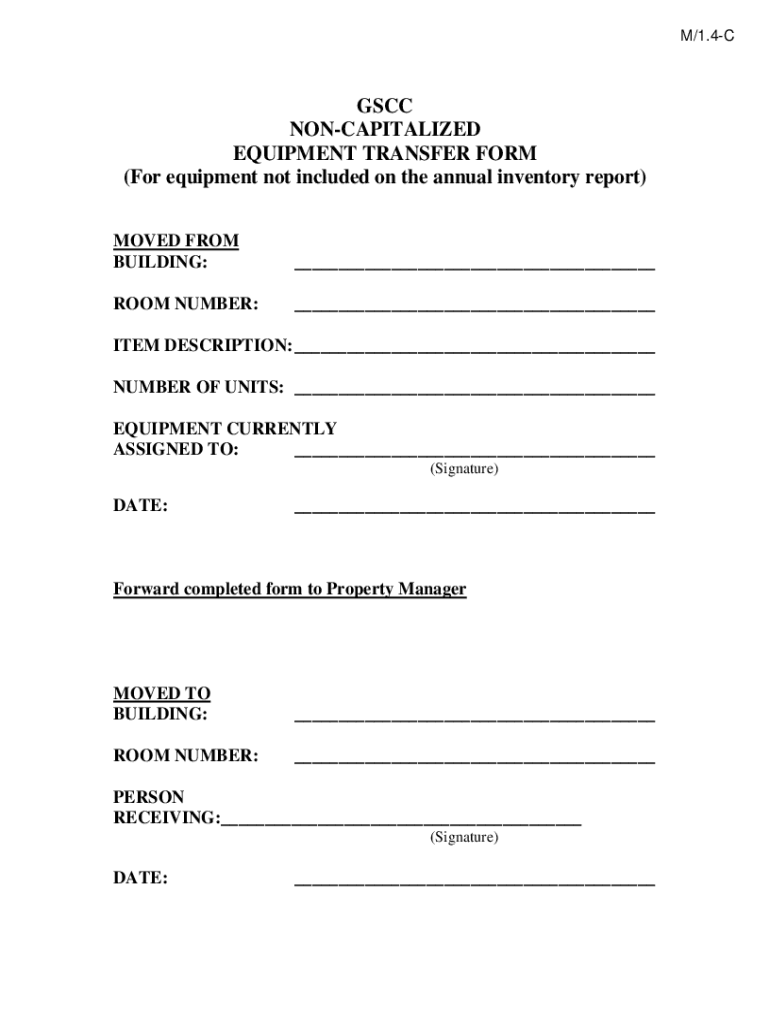 M/1.4CGSCC UNCAPITALIZED EQUIPMENT TRANSFER FORM (For equipment not included on the annual inventory report) MOVED FROM BUILDING:___ROOM NUMBER:___ITEM DESCRIPTION: ___ NUMBER OF UNITS: ___ EQUIPMENT