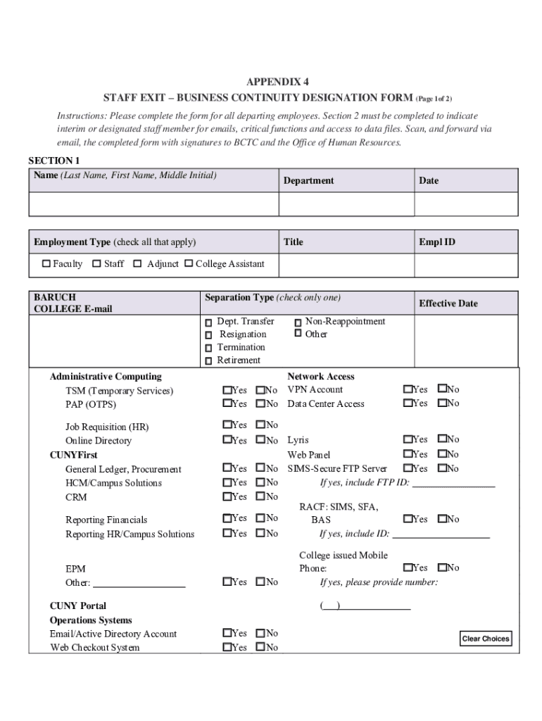 APPENDIX 4 STAFF EXIT BUSINESS CONTINUITY DESIGNATION FORM (Page 1of 2) Instructions: Please complete the form for all departing employees. Section 2 must be completed to indicate interim or designated