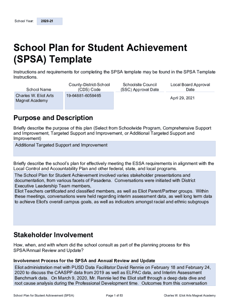School Year:202021SPSA Title Preschool Plan for Student Achievement (SPA) Template Instructions and requirements for completing the SPA template may be found in the SPA Template Instructions. School