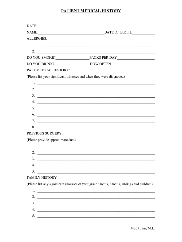 PATIENT MEDICAL HISTORY DATE: ___ NAME:___DATE OF BIRTH:___ ALLERGIES: 1. ___ 2. ___ DO YOU SMOKE?___PACKS PER DAY___ DO YOU DRINK?___HOW OFTEN___ PAST MEDICAL HISTORY: (Please list your significant