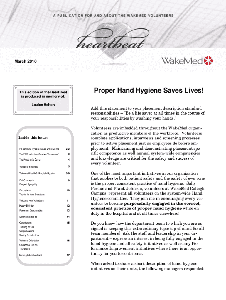 March 2010Proper Hand Hygiene Saves Lives! This edition of the Heartbeat is produced in memory of: Louise Deltona this statement to your placement description standard responsibilities Be a lifesaver