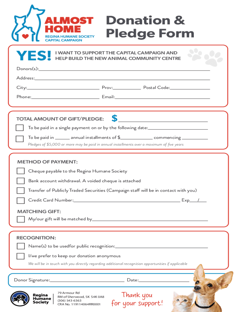 HELP BUILD THE NEW ANIMAL COMMUNITY CENTREDonors(s):Address:City:Prov:Phone:Email:TOTAL AMOUNT OF GIFT/PLEDGE:Postal Code:to be