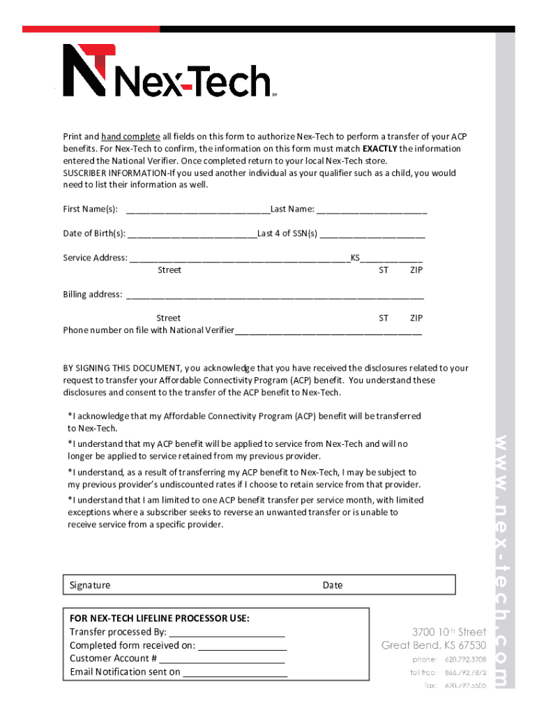 Print and hand complete all fields on this form to authorize Edtech to perform a transfer of your ACP benefits. For Edtech to confirm, the information on this form must match EXACTLY the information
