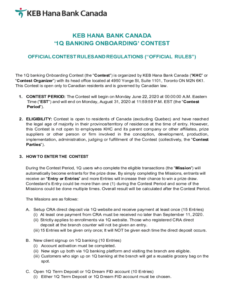 KEY HAND BANK CANADA 1Q BANKING ONBOARDING CONTEST OFFICIAL CONTEST RULES AND REGULATIONS (OFFICIAL RULES)The 1Q banking Onboarding Contest (the Contest) is organized by KEY Haney Bank Canada (kHz