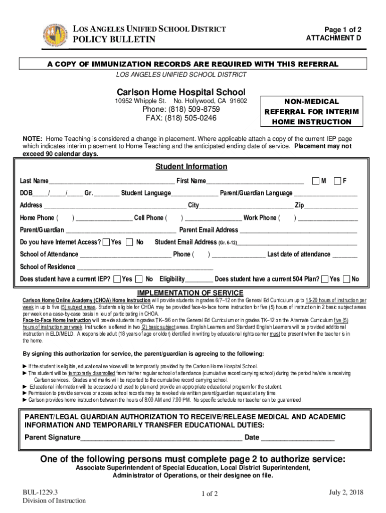 LOS ANGELES UNIFIED SCHOOL DISTRICT POLICY BULLETIN Page 1 of 2 ATTACHMENT DA COPY OF IMMUNIZATION RECORDS ARE REQUIRED WITH THIS REFERRAL LOS ANGELES UNIFIED SCHOOL DISTRICT Carlson Home Hospital