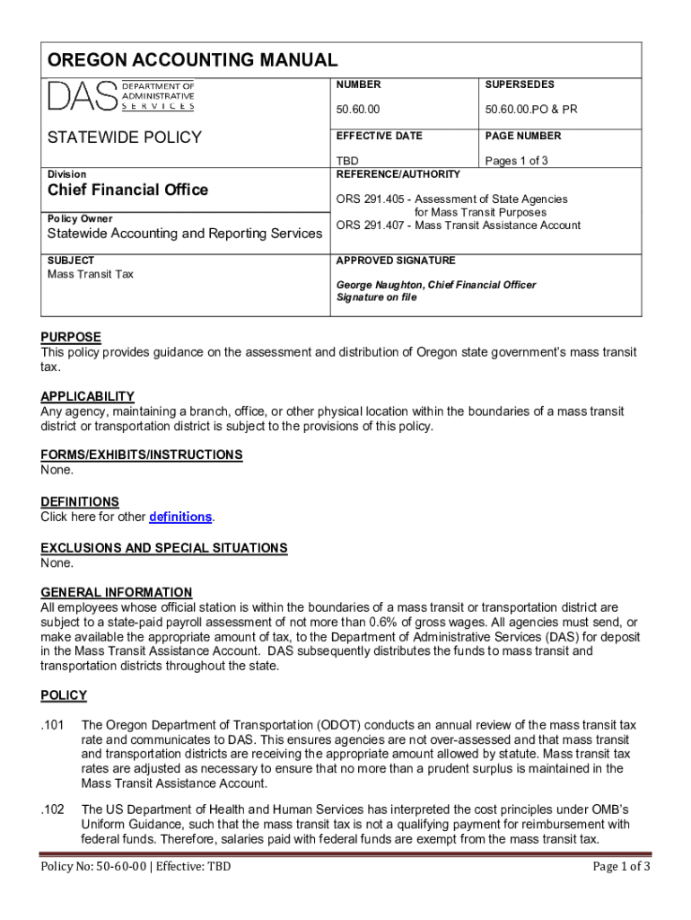OREGON ACCOUNTING MANUALSTATEWIDE POLICY DivisionChief Financial Office Policy OwnerStatewide Accounting and Reporting Services SUBJECT Mass Transit TaxNUMBERSUPERSEDES50.60.0050.60.00.PO & EFFECTIVE
