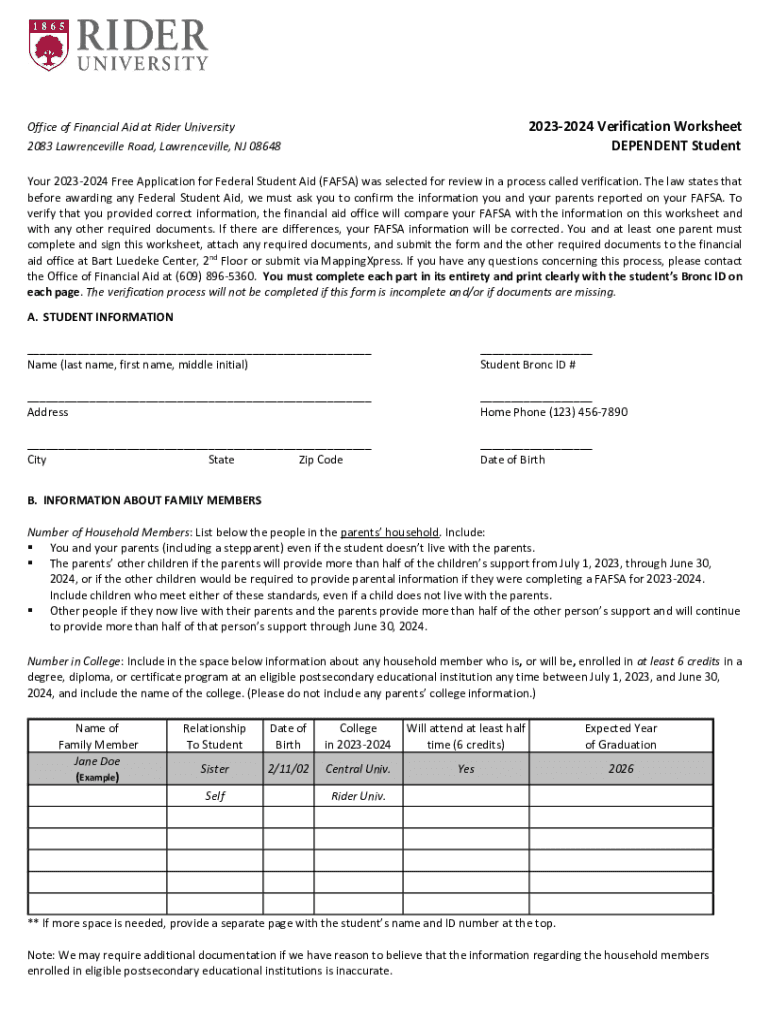 20232024 Verification Worksheet DEPENDENT StudentOffice of Financial Aid at Rider University 2083 Lawrenceville Road, Lawrenceville, NJ 08648Your 20232024 Free Application for Federal Student Aid
