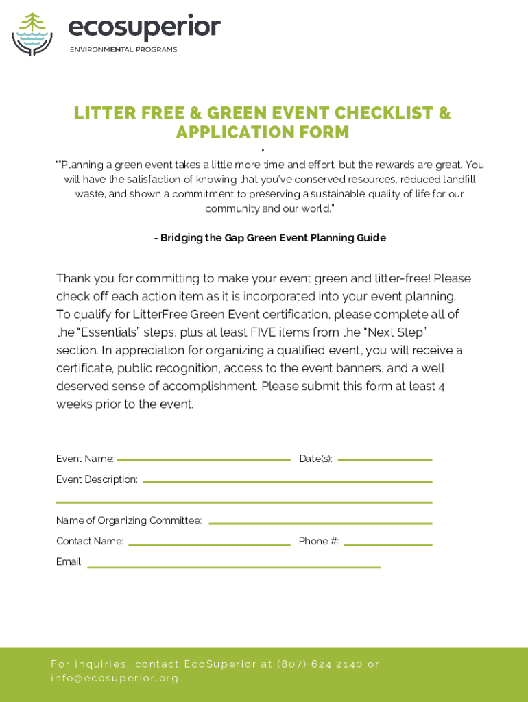 LITTER FREE & GREEN EVENT CHECKLIST & APPLICATION FORM \” \” Planning a green event takes a little more time and effort, but the rewards are great. You will have the satisfaction of knowing that