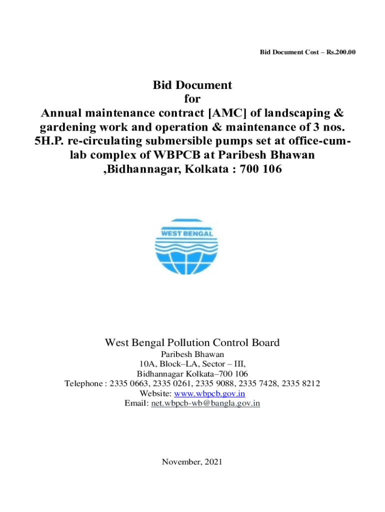 Bid Document Cost Rs.200.00Bid Document for Annual maintenance contract [AMC] of landscaping & gardening work and operation & maintenance of 3 nos. 5H. P. recirculating submersible pumps set at officecumlab