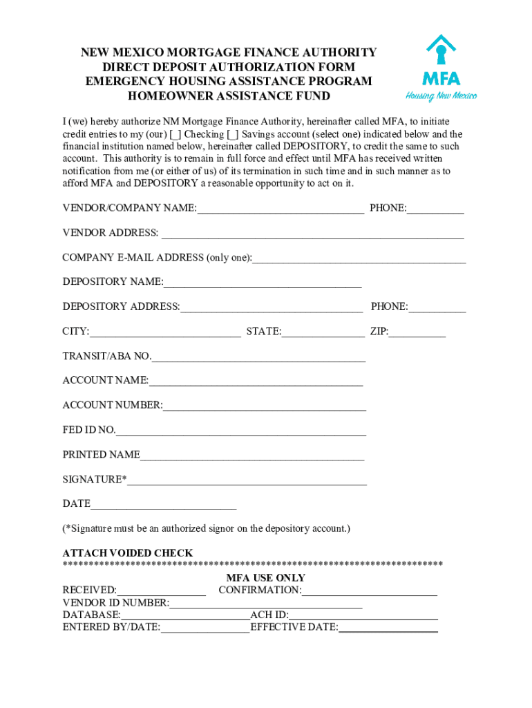 NEW MEXICO MORTGAGE FINANCE AUTHORITY DIRECT DEPOSIT AUTHORIZATION FORM EMERGENCY HOUSING ASSISTANCE PROGRAM HOMEOWNER ASSISTANCE FUND I (we) hereby authorize NM Mortgage Finance Authority, hereinafter