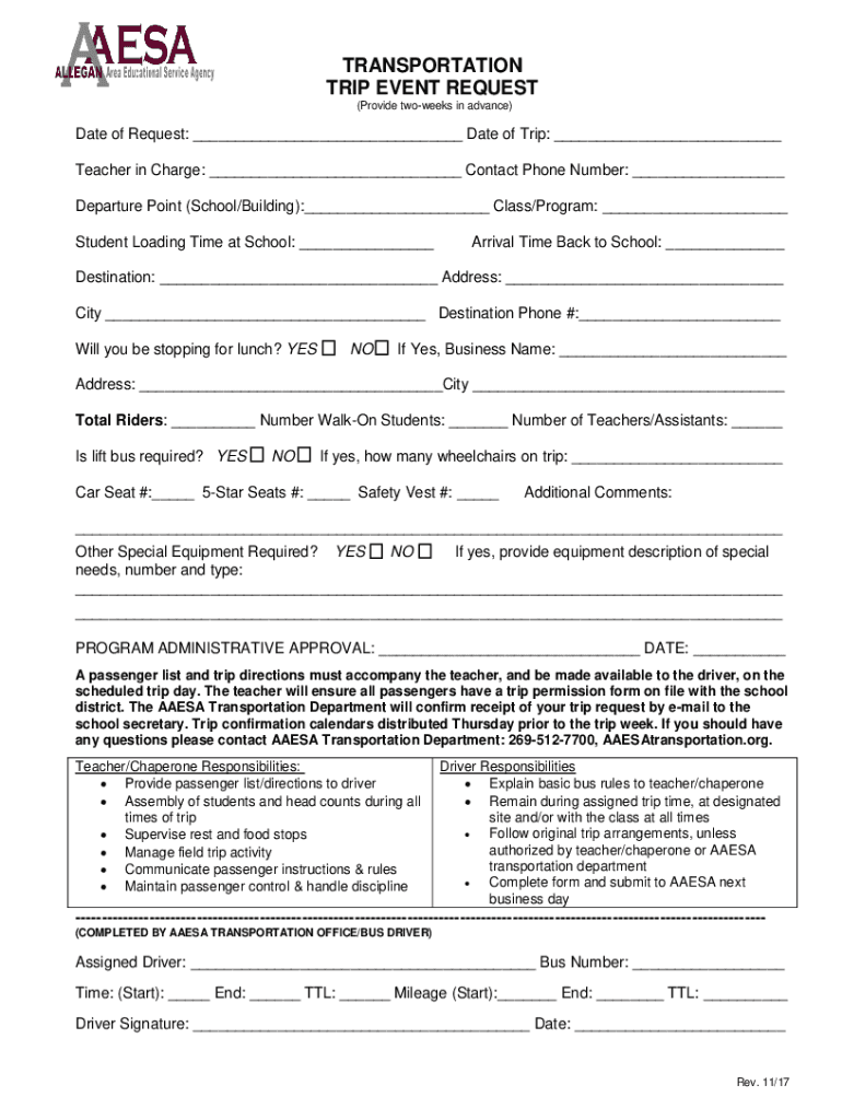TRANSPORTATION TRIP EVENT REQUEST (Provide two weeks in advance)Date of Request: ___ Date of Trip: ___ Teacher in Charge: ___ Contact Phone Number: ___ Departure Point (School/Building):___ Class/Program: