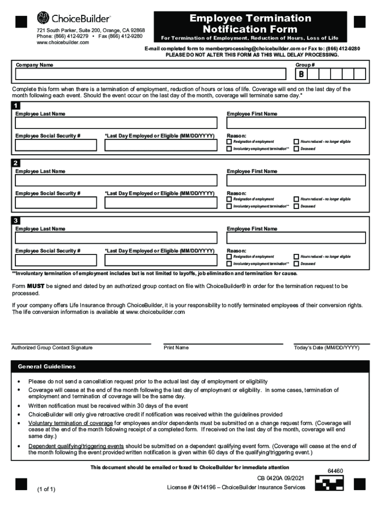 Employee Termination Notification Form721 South Parker, Suite 200, Orange, CA 92868 Phone: (866) 4129279 Fax (866) 4129280 For Termination of Employment, Reduction of Hours, Loss of Life www.choicebuilder.com