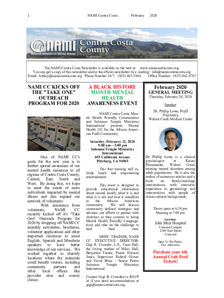 1NAMI Contra CostaFebruary2020The NAME Contra Costa Newsletter is available on the web at: www.namicontracosta.orgYou can get a copy of this newsletter and/or the news newsletter by e-mailing: info@namicontracosta.org