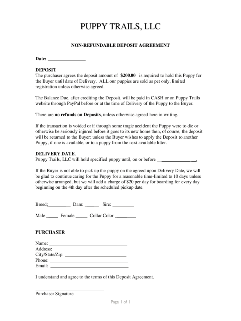 Obtain a copy of the non-refundable puppy deposit agreement form.