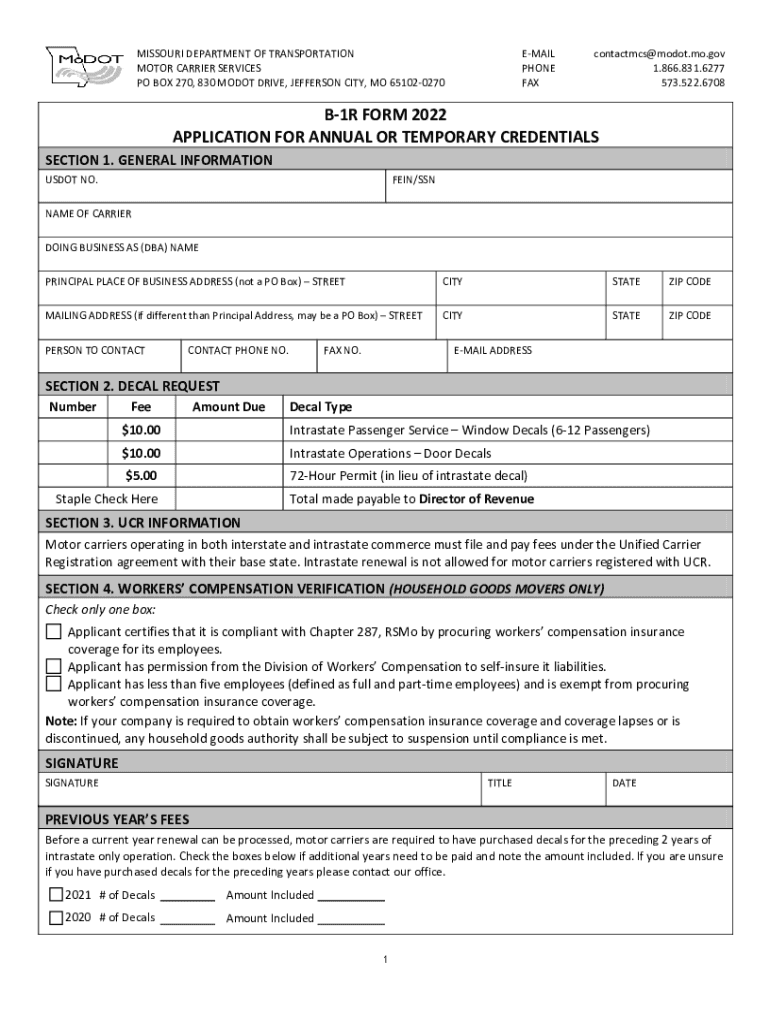 MISSOURI DEPARTMENT OF TRANSPORTATION MOTOR CARRIER SERVICES PO BOX 270, 830 MOOT DRIVE, JEFFERSON CITY, MO 651020270EMAIL PHONE FAXcontactmcs@modot.mo.gov 1.866.831.6277 573.522.6708B1R FORM 2022