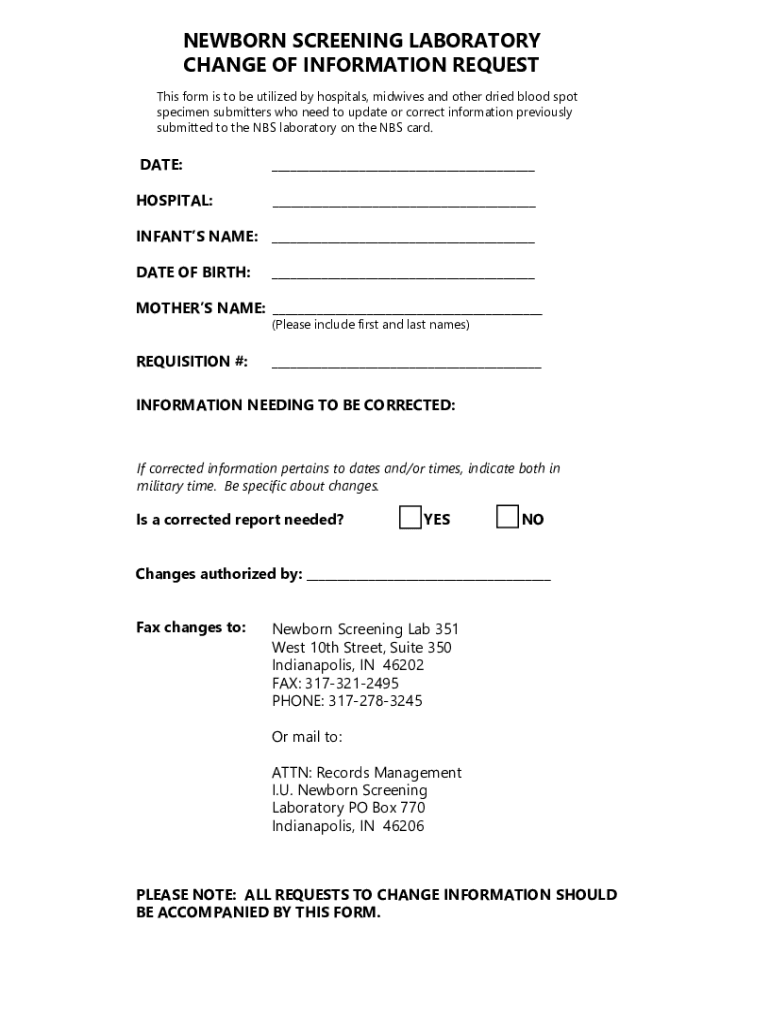 NEWBORN SCREENING LABORATORY CHANGE OF INFORMATION REQUEST This form is to be utilized by hospitals, midwives and other dried blood spot specimen submitters who need to update or correct information