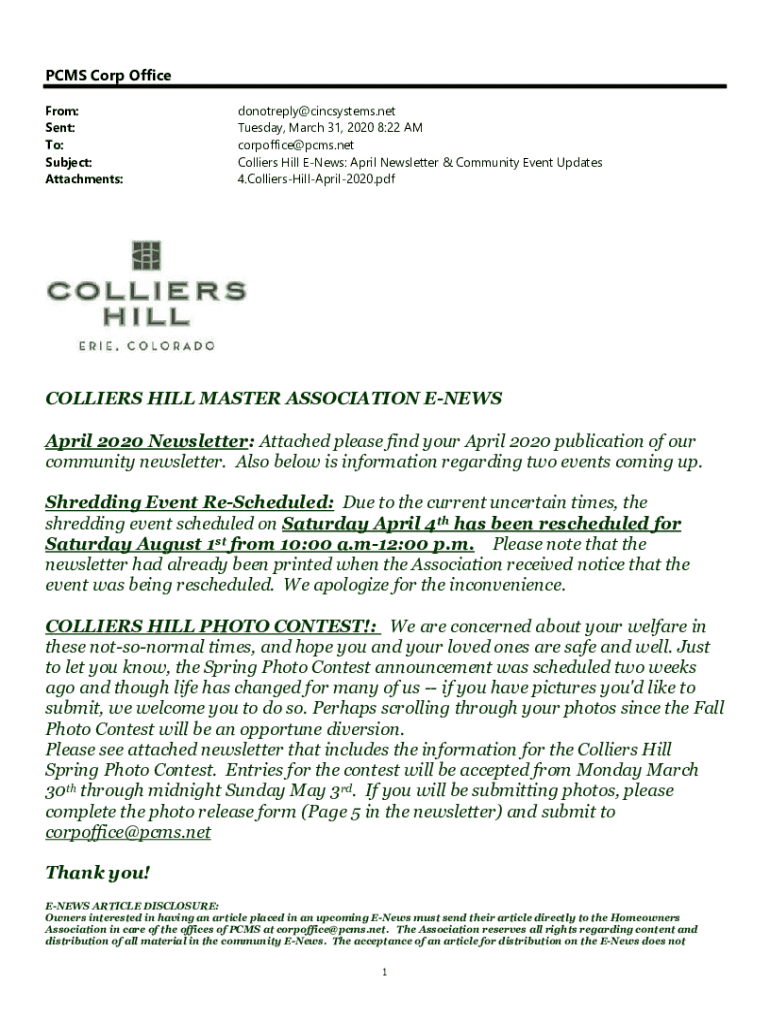 PCs Corp Office From: Sent: To: Subject: Attachments:donotreply@cincsystems.net Tuesday, March 31, 2020 8:22 AM corpoffice@pcms.net Colliers Hill News: April Newsletter & Community Event Updates 4.