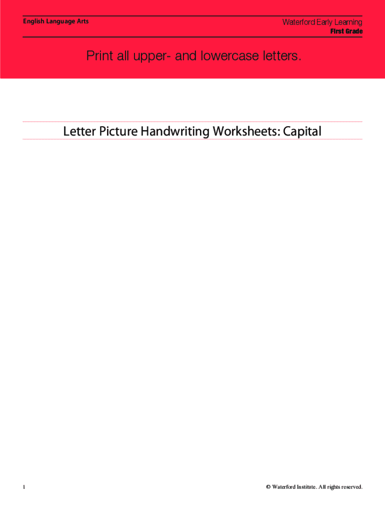 English Language Arts Waterford Early Learning First Reprint all upper and lowercase letters. Letter Picture Handwriting Worksheets: Capital1 Waterford Institute. All rights reserved.2 Waterford Institute.