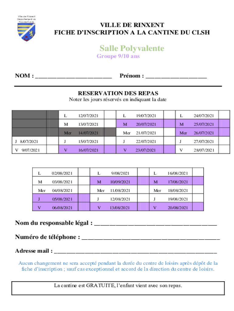Villa de Rinxent Department du PasdeCalaisVILLE DE INTENT FICHE INSCRIPTION À la CANINE DU Closable Polyvalence Group 9/10 and NOT : ___Prom : ___RESERVATION DES REPAY Noted LES hours serve en indignant