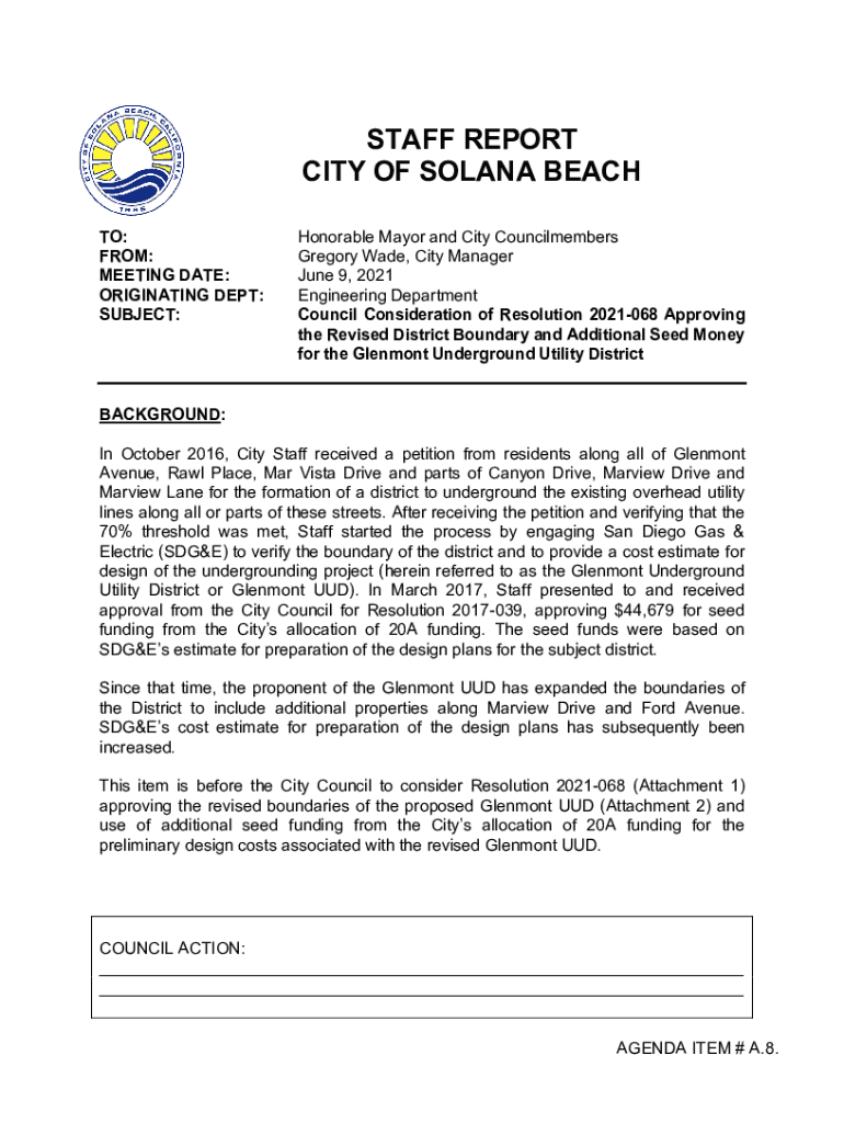 STAFF REPORT CITY OF SOLANO BEACH TO: FROM: MEETING DATE: ORIGINATING DEPT: SUBJECT:Honorable Mayor and City Council members Gregory Wade, City Manager June 9, 2021, Engineering Department Council