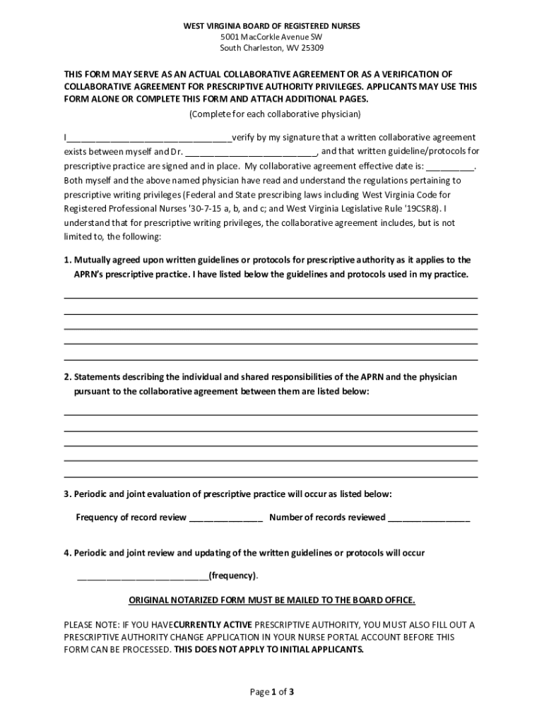 WEST VIRGINIA BOARD OF REGISTERED NURSES 5001 Markle Avenue SW South Charleston, WV 25309THIS FORM MAY SERVE AS AN ACTUAL COLLABORATIVE AGREEMENT OR AS A VERIFICATION OF COLLABORATIVE AGREEMENT FOR