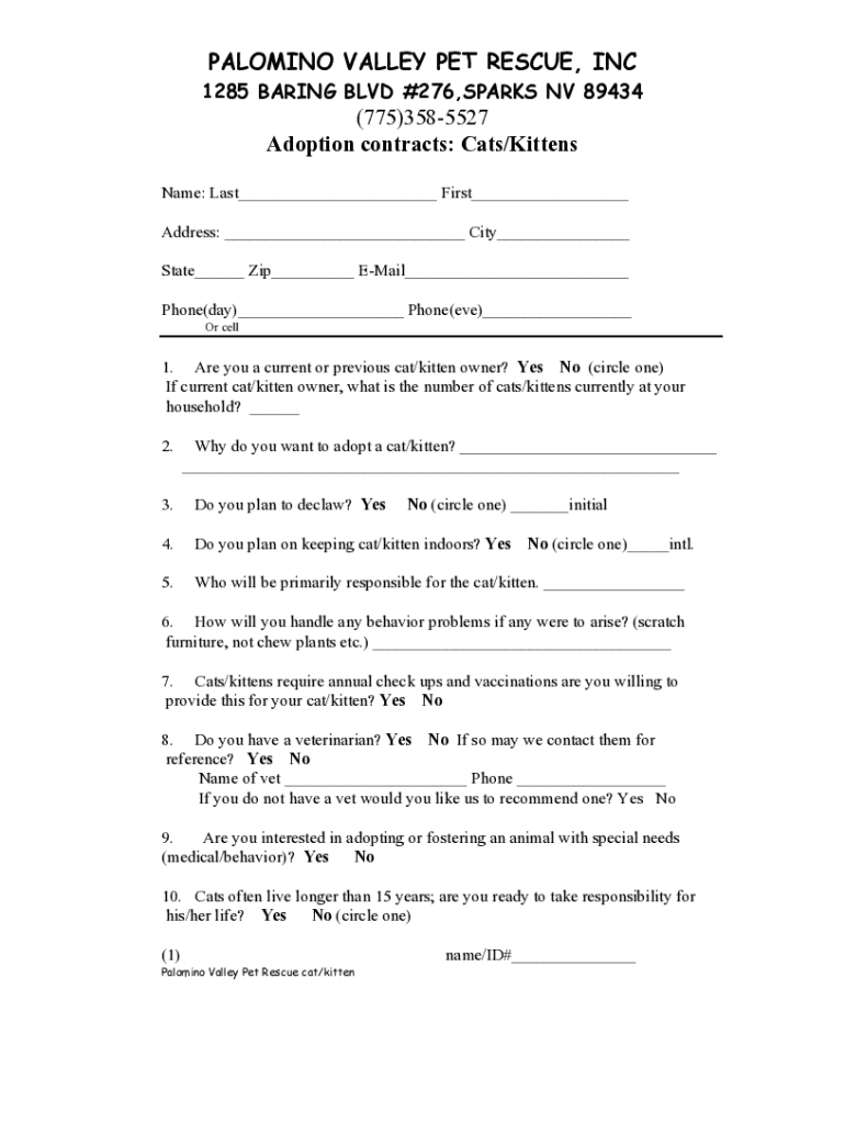 PALOMINO VALLEY PET RESCUE, INC 1285 BARING BLVD #276,SPARKS NV 89434(775)3585527 Adoption contracts: Cats/Kittens Name: Last___ First___ Address: ___ City___ State___ Zip___ Email___ Phone(day)___