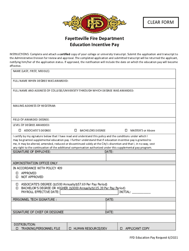 CLEAR FORM Fayetteville Fire Department Education Incentive Pay INSTRUCTIONS: Complete and attach a certified copy of your college or university transcript. Submit the application and transcript to